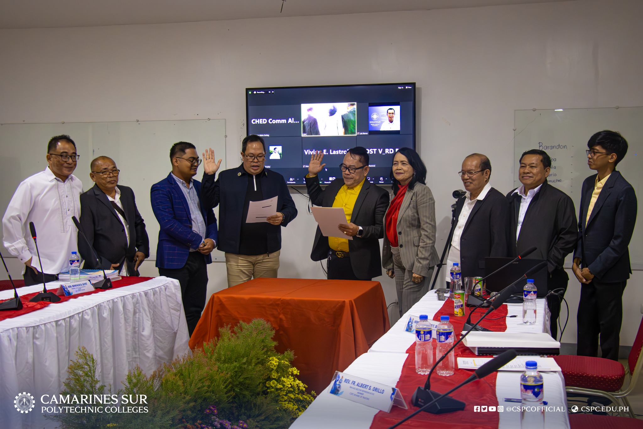 Dr. Amado A. Oliva, Jr. takes his oath of office as the 6th College President of Camarines Sur Polytechnic Colleges before the CSPC Board of Trustees, led by CHED Commissioner Aldrin A. Darilag, on Thursday, 23 November 2023.