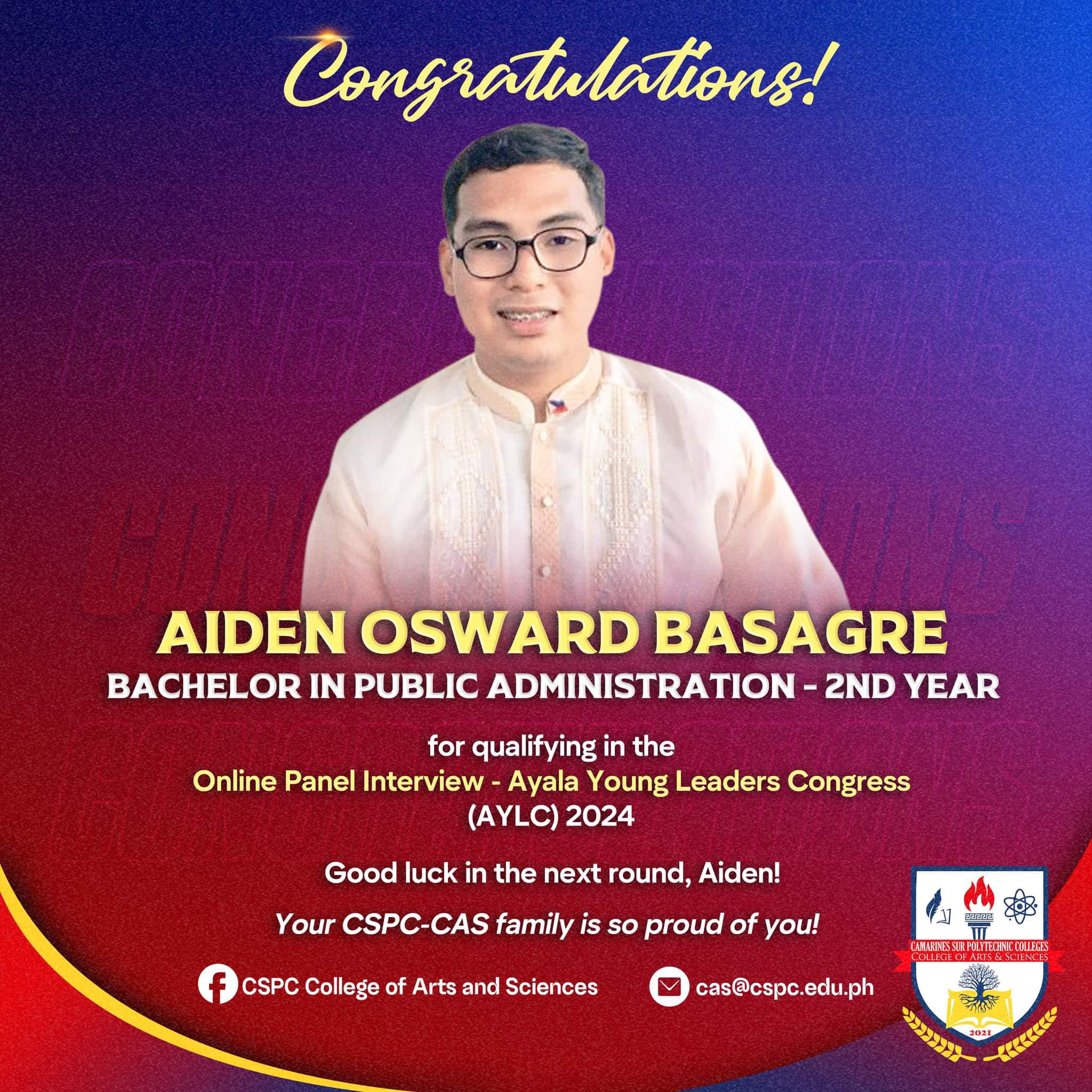We are thrilled to announce that Aiden Osward Basagre, a student leader of CSPC-CAS, has qualified for the Online Panel Interview of the prestigious Ayala Young Leaders Congress (AYLC) 2024!