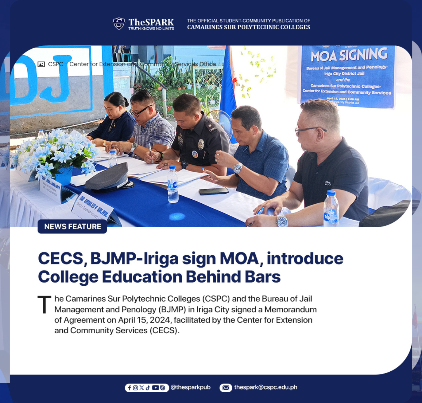 The Camarines Sur Polytechnic Colleges (CSPC) and the Bureau of Jail Management and Penology (BJMP) in Iriga City signed a Memorandum of Agreement on April 15, 2024, facilitated by the Center for Extension and Community Services (CECS).