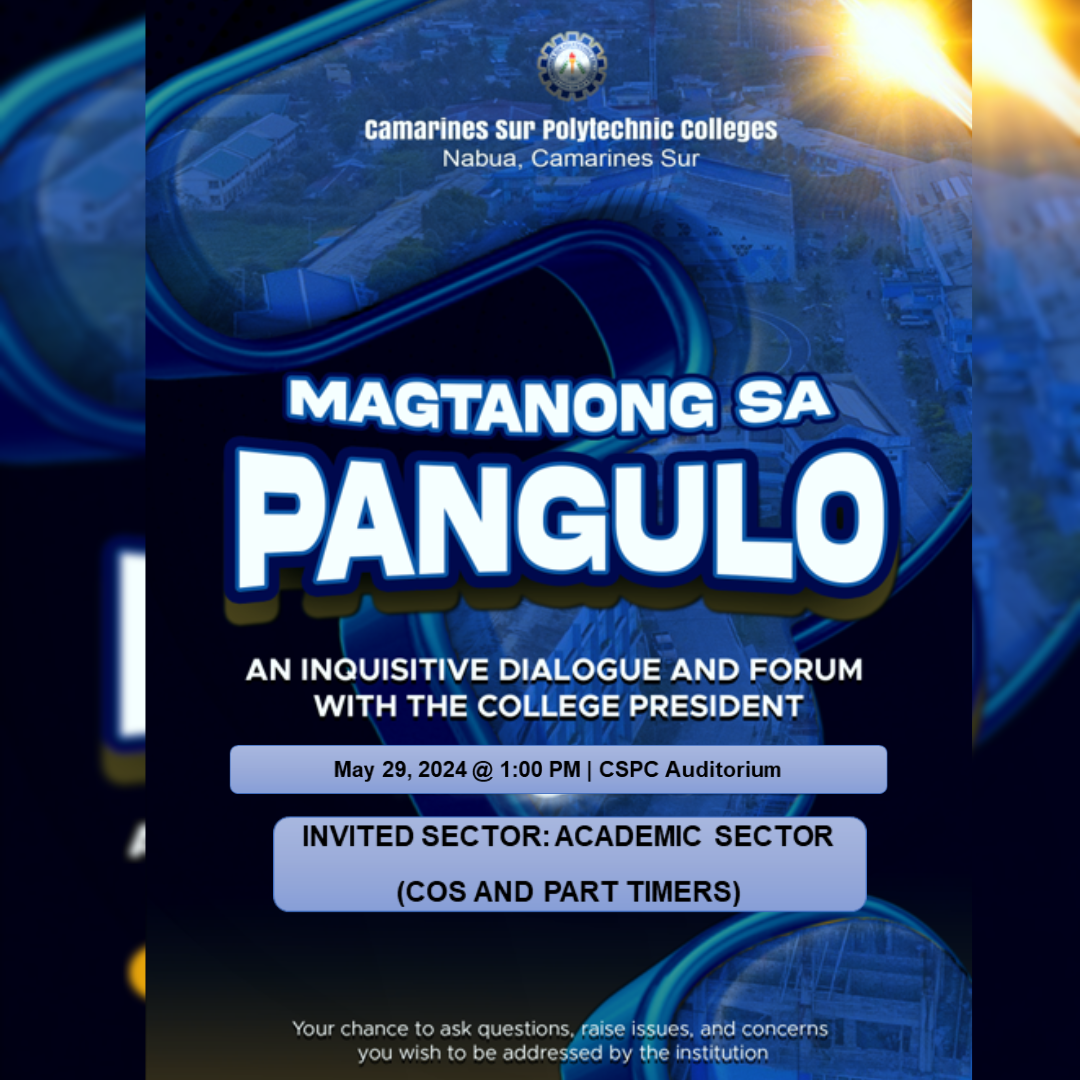 Announcement from PRAAS Invitation to all COS FACULTY AND PART-TIMERS to attend the Magtanong sa Pangulo On May 29, 2024, 1:00 PM at CSPC Auditorium.