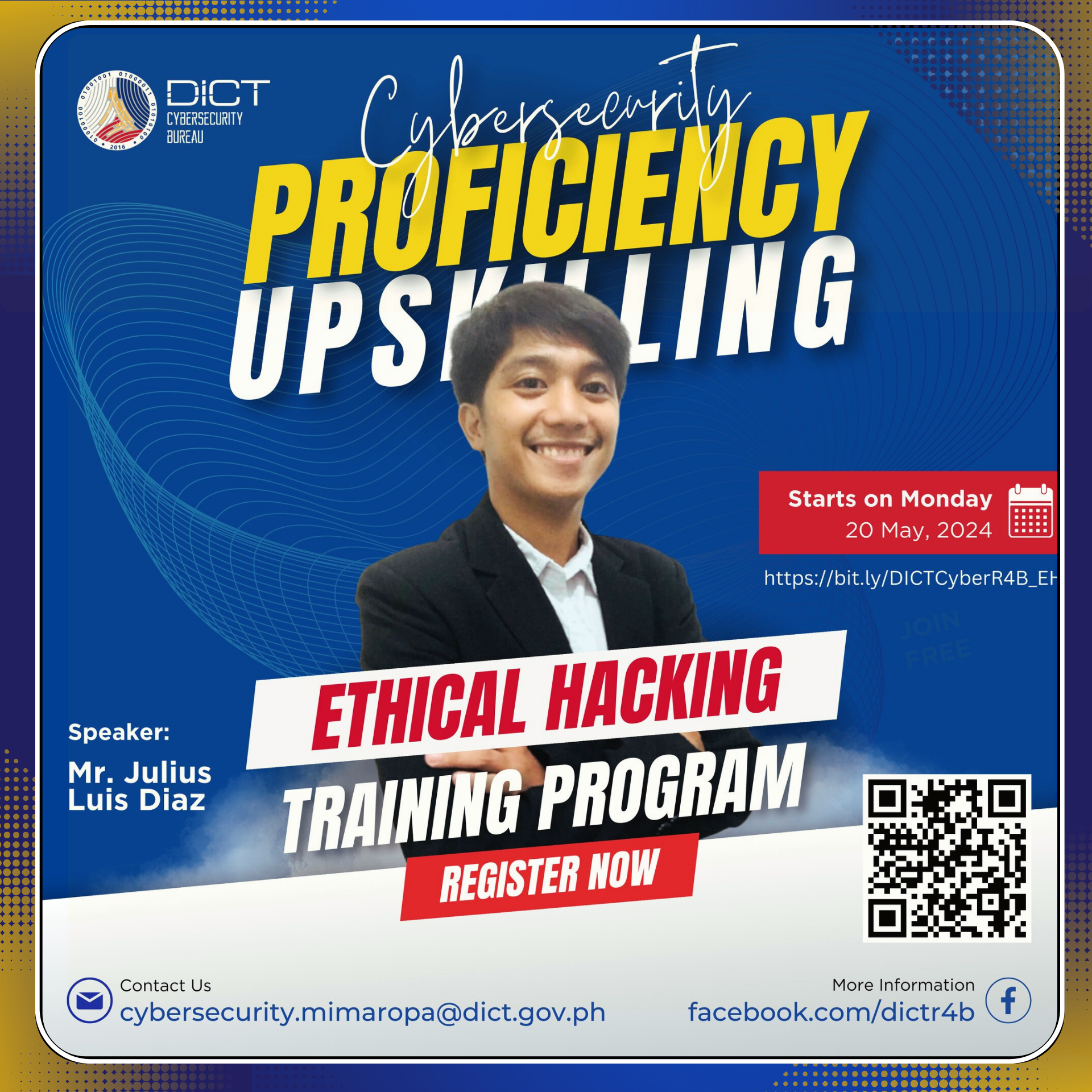 Don’t miss your chance to level up in cybersecurity for 𝗙𝗥𝗘𝗘! Join our upcoming Cybersecurity Proficiency Upskilling: 𝗘𝘁𝗵𝗶𝗰𝗮𝗹 𝗛𝗮𝗰𝗸𝗶𝗻𝗴 𝗧𝗿𝗮𝗶𝗻𝗶𝗻𝗴 𝗣𝗿𝗼𝗴𝗿𝗮𝗺 and earn a certificate upon completing this 40-hour program. Date: May 20-24, 2024 and June 3-7, 2024 Time: 1:00pm to 5:00pm Registration Link: https://bit.ly/DICTCyberR4B_EH Platform: Virtual via Zoom (500 max capacity) Gain hands-on experience,...Read More