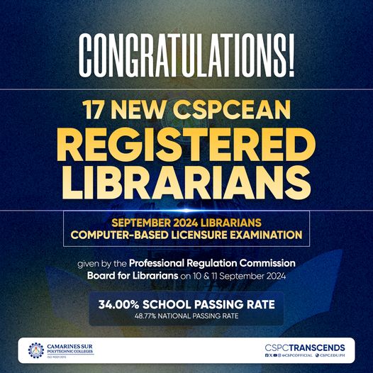 𝗔𝗡𝗢𝗧𝗛𝗘𝗥 𝗢𝗡𝗘 𝗙𝗢𝗥 𝗧𝗛𝗘 𝗕𝗢𝗢𝗞𝗦 📚 Camarines Sur Polytechnic Colleges proudly opens a new chapter in its legacy as 17 alumni passed the September 2024 Librarians Computer-Based Licensure Examination: ∙ Argarin, Erica B. ∙ Avila, Juvelyn C. ∙ Bacsal, Teresa D. ∙ Berces, Kimberly Kate S. ∙ Chavez, Vanessa A. ∙ Comerciase, Maila B. ∙...Read More