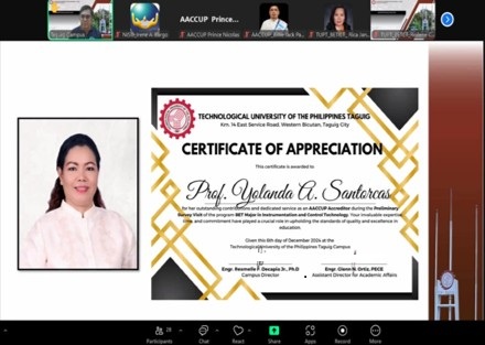 Dr. Yolanda A. Santorcas, a dedicated faculty member of CSPC, has been invited to serve as an accreditor by the Accrediting Agency of Chartered Colleges and Universities in the Philippines (AACCUP). From December 2 to 6, 2024, she participated in the online Preliminary Survey Visit for the Bachelor of Engineering Technology Major in Instrumentation and Control Technology program of the Technological University of the Philippines (TUP), Taguig City Campus.