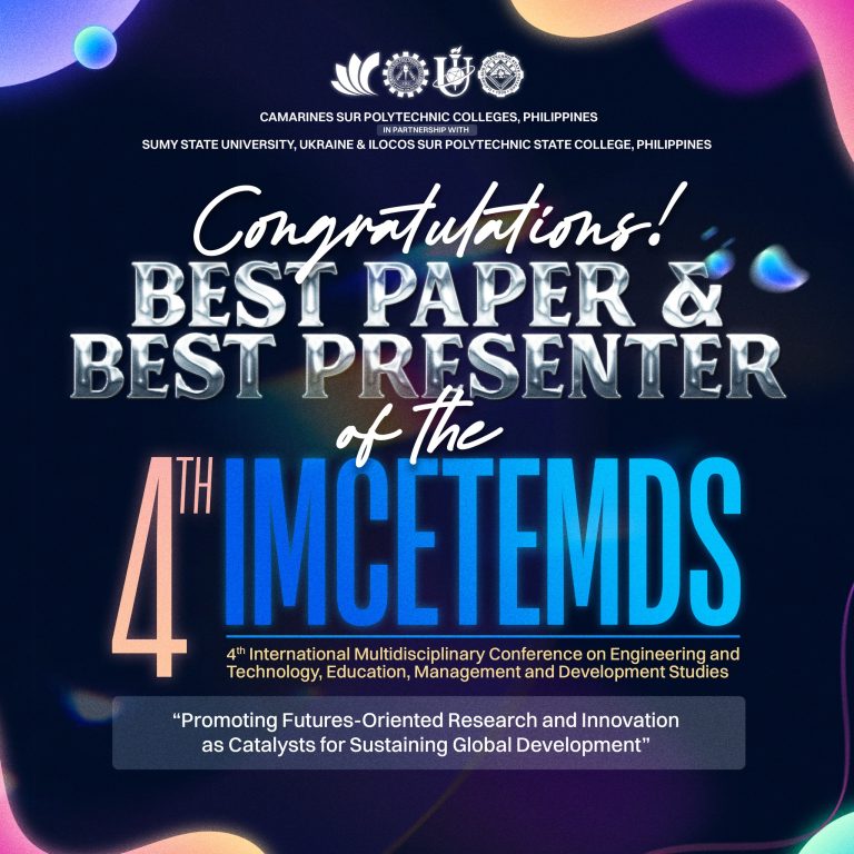 CSPC proudly recognizes the outstanding researchers and presenters who excelled during the 4th International Multidisciplinary Conference on Engineering and Technology, Education, Management, and Development Studies.