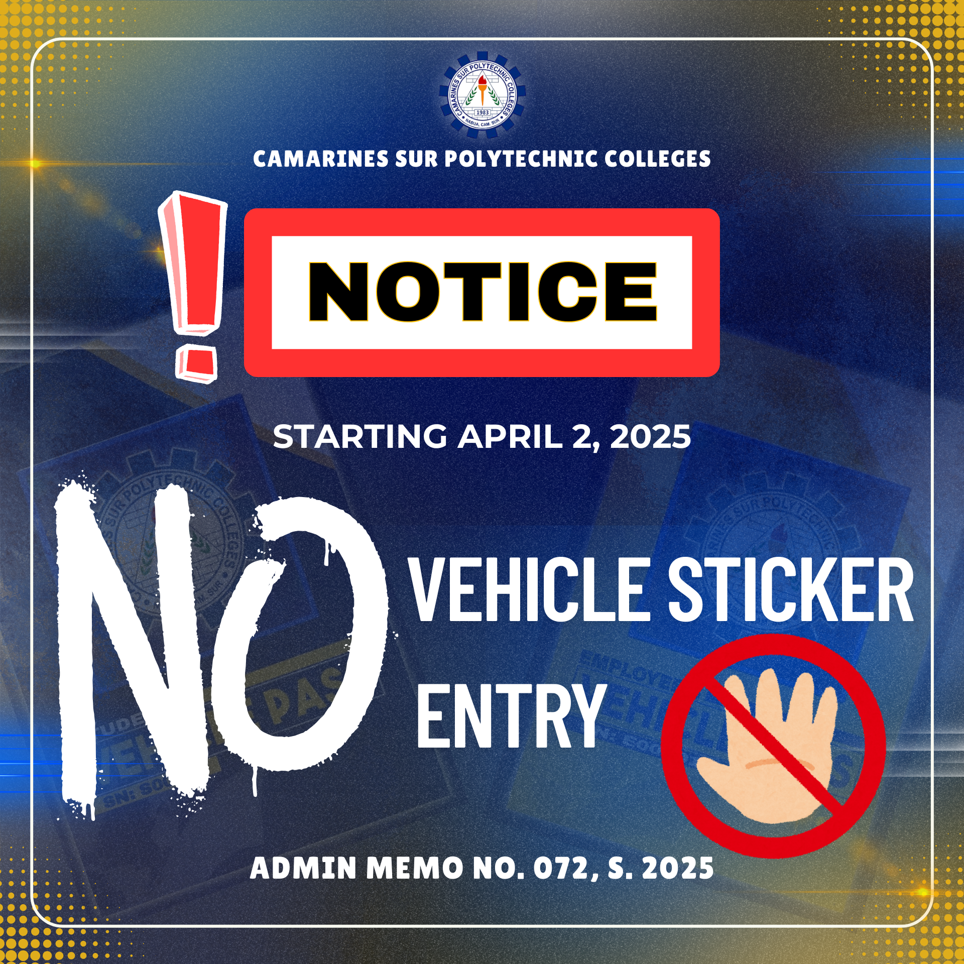 A “No Vehicle Sticker, No Entry” policy will be implemented at Camarines Sur Polytechnic Colleges (CSPC) starting April 2, 2025 (Wednesday). This policy, aimed at maintaining order and security, is authorized by Approved Resolution No. 2024-45 of the CSPC Administrative Council. Vehicle stickers are available to CSPC students and employees at the Production and Auxiliary...Read More