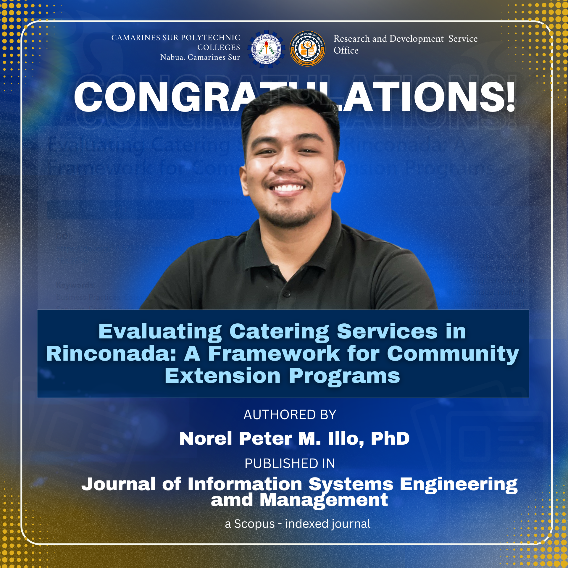 𝗖𝗢𝗡𝗚𝗥𝗔𝗧𝗨𝗟𝗔𝗧𝗜𝗢𝗡𝗦 | The Camarines Sur Polytechnic Colleges – Research and Development Services Office (CSPC-RDSO) proudly congratulates Norel Peter M. Illo, PhD, for the successful publication of his research titled “Evaluating Catering Services in Rinconada: A Framework for Community Extension Programs” in the Journal of Information Systems Engineering and Management, a Scopus-indexed journal! Your commitment to...Read More