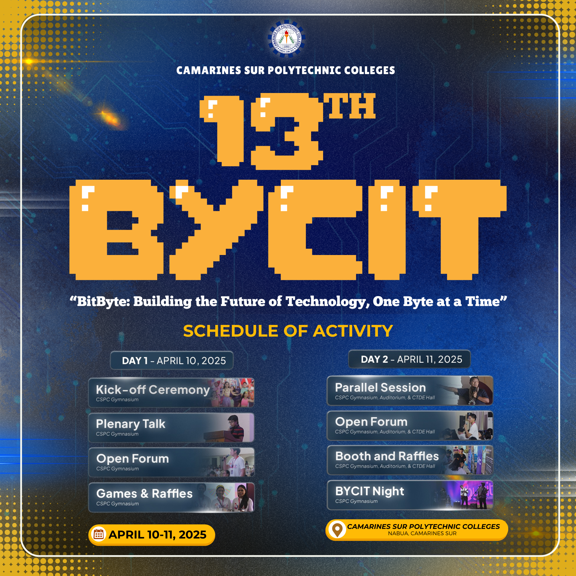 The Junior Philippine Computer Society- (JPCS-CSPC) Chapter will host the 13th Bicol Youth Congress in Information Technology (BYCIT) at the Camarines Sur Polytechnic Colleges. Billed as the region’s largest IT convention for students, the annual BYCIT event will feature IT experts from across the Philippines. The congress aims to provide a platform for future IT...Read More