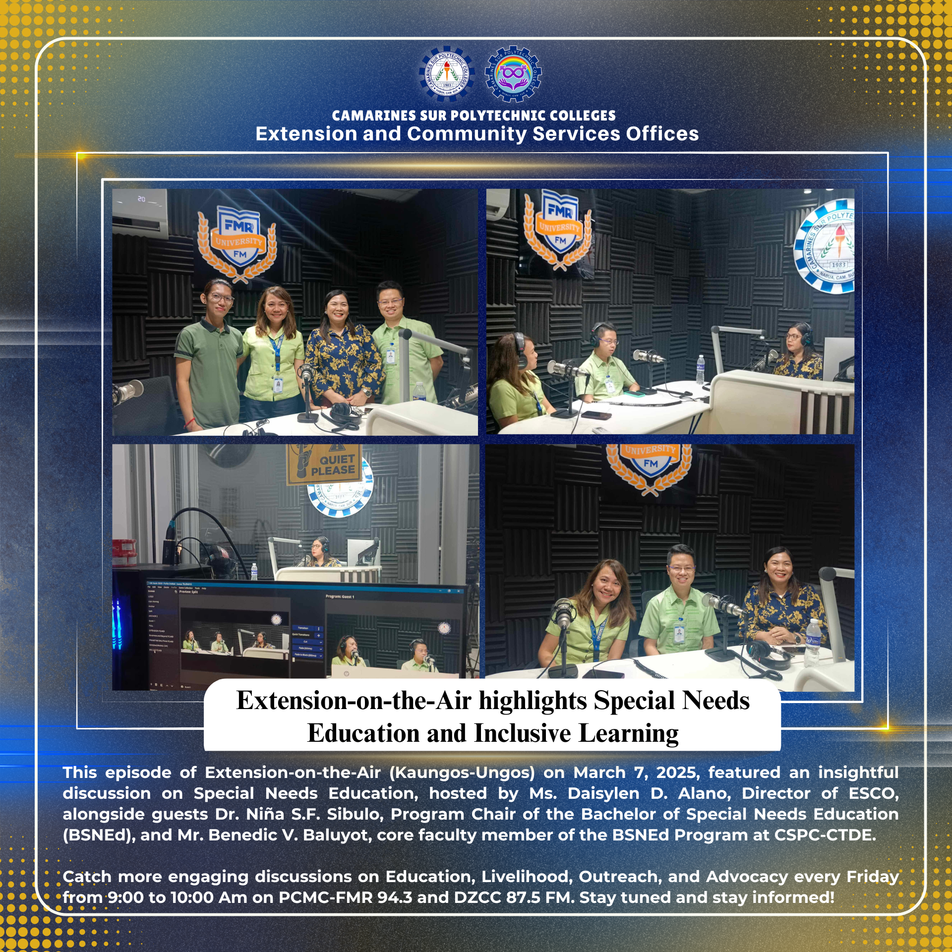 This episode of Extension-on-the-Air (Kaungos-Ungos) on March 7, 2025, featured an insightful discussion on Special Needs Education, hosted by Ms. Daisylen D. Alano, Director of ESCO, alongside guests Dr. Niña S.F. Sibulo, Program Chair of the Bachelor of Special Needs Education (BSNEd), and Mr. Benedic V. Baluyot, core faculty member of the BSNEd Program at...Read More