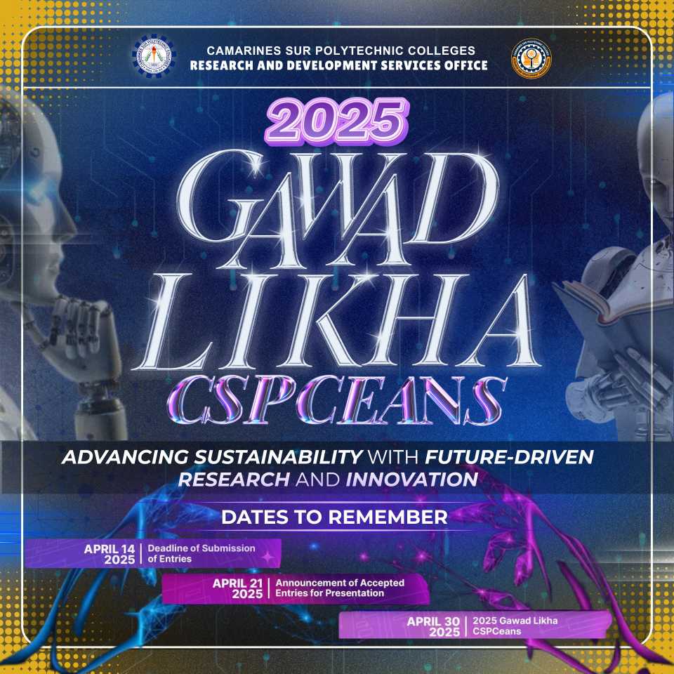 CSPCeans, are you passionate about creating sustainable solutions and innovations? The Camarines Sur Polytechnic Colleges – Research and Development Services Office invites you to showcase your groundbreaking ideas and talents in research in the 𝟮𝟬𝟮𝟱 𝗚𝗔𝗪𝗔𝗗 𝗟𝗜𝗞𝗛𝗔 𝗖𝗦𝗣𝗖𝗘𝗔𝗡𝗦. This year’s theme, “𝘈𝘥𝘷𝘢𝘯𝘤𝘪𝘯𝘨 𝘚𝘶𝘴𝘵𝘢𝘪𝘯𝘢𝘣𝘪𝘭𝘪𝘵𝘺 𝘸𝘪𝘵𝘩 𝘍𝘶𝘵𝘶𝘳𝘦-𝘋𝘳𝘪𝘷𝘦𝘯 𝘙𝘦𝘴𝘦𝘢𝘳𝘤𝘩 𝘢𝘯𝘥 𝘐𝘯𝘯𝘰𝘷𝘢𝘵𝘪𝘰𝘯,” highlights the need for initiative-taking and forward-thinking...Read More