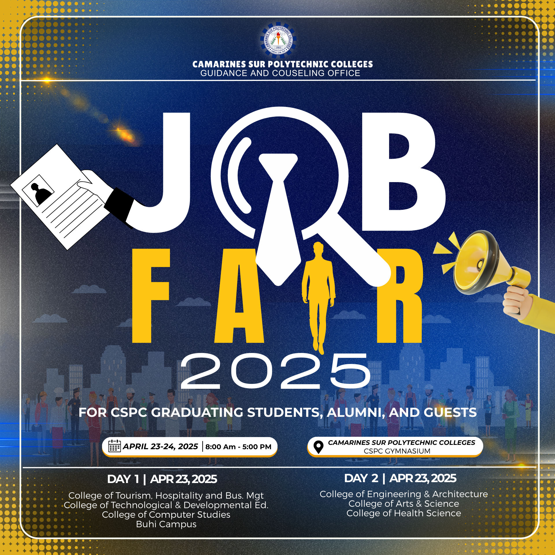 To our Dear Graduating Students: Join us for Job Fair 2025 on April 23–24, 2025 at the CSPC Gymnasium in collaboration with Metro Naga Public Employment Service Office and other agencies and the Virtual Career Fair on April 25, 2025 via Zoom in partnership with Jobs180.com. Don’t miss this chance to start building your future!...Read More