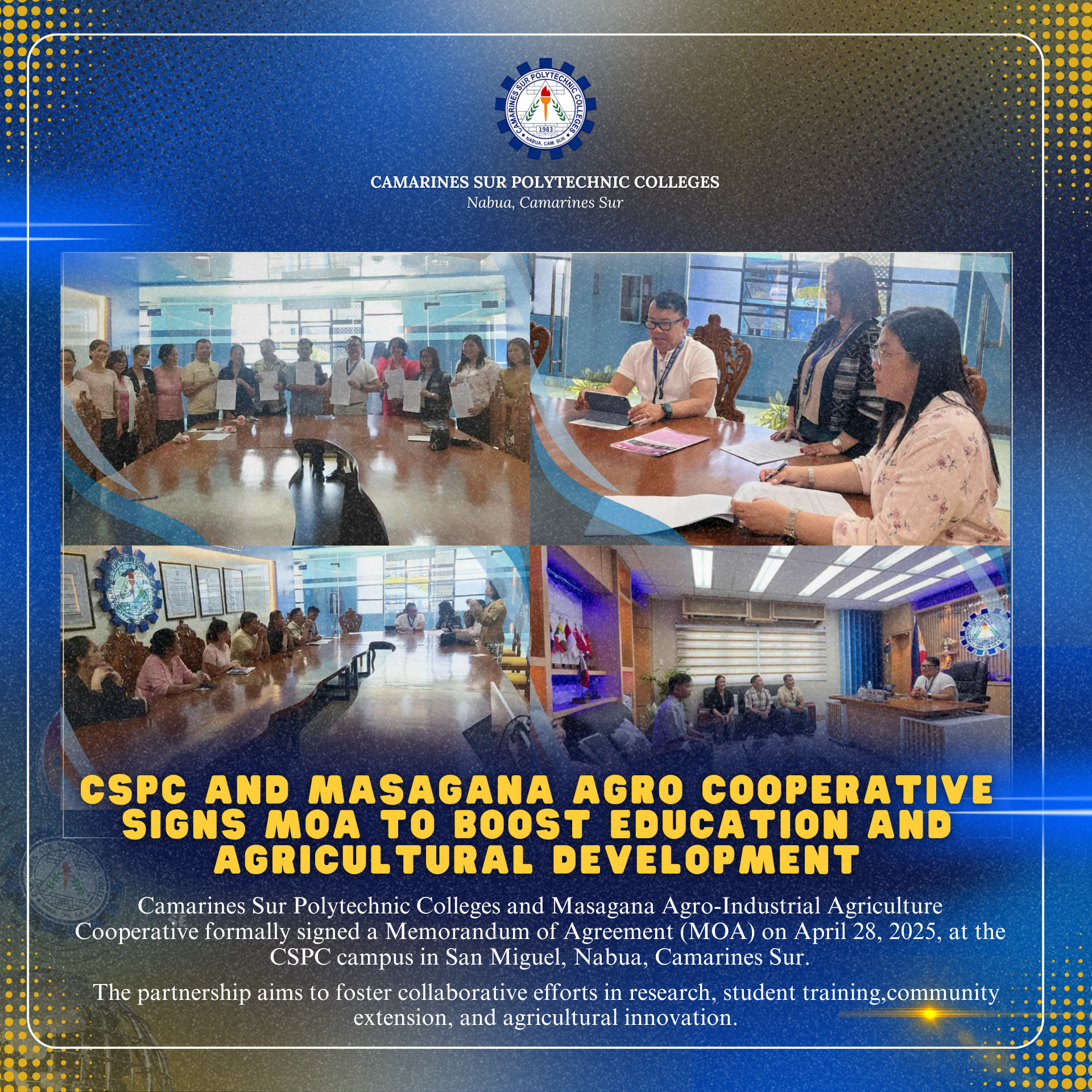 Camarines Sur Polytechnic Colleges and Masagana Agro-Industrial Agriculture Cooperative formally signed a Memorandum of Agreement (MOA) on April 28, 2025, at the CSPC campus in San Miguel, Nabua, Camarines Sur. The partnership aims to foster collaborative efforts in research, student training,community extension, and agricultural innovation. Source: Information, Broadcast, and Alumni Affairs UnitRead More