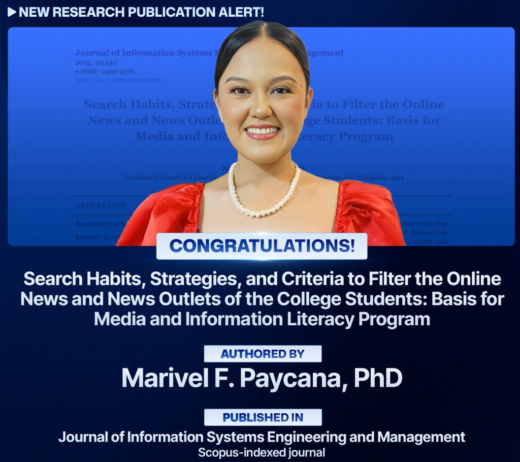 C๐ข๐ก๐๐ฅ๐๐ง๐จ๐๐๐ง๐๐ข๐ก๐ฆ | The Camarines Sur Polytechnic Colleges (CSPC) – Research and Development Services Office (RDSO) proudly extends its warmest congratulations to Marivel F. Paycana, PhD, for the successful publication of her research titled โSearch Habits, Strategies, and Criteria to Filter the Online News and News Outlets of the College Students: Basis for Media and Information Literacy Programโ in the Journal of Information Systems Engineering and Management (JISEM), a Scopus-indexed journal.