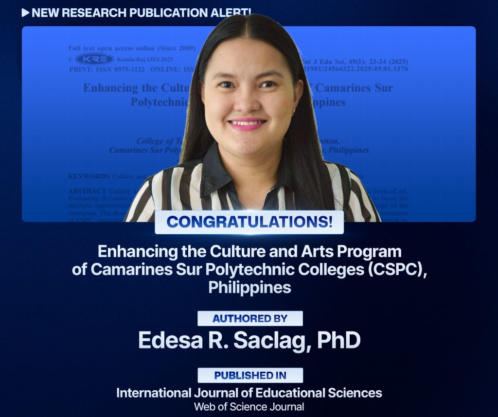 The Research and Development Services Office proudly congratulates Dr. Edesa R. Saclag on her latest research publication, titled “Enhancing the Culture and Arts Program of Camarines Sur Polytechnic Colleges (CSPC), Philippines,” which was published in the International Journal of Educational Sciences, a Web of Science Journal.