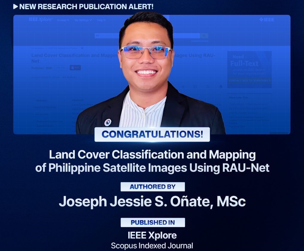 The Research and Development Services Office proudly congratulates Mr. Joseph Jessie S. Oñate for the successful publication of his study titled “Land Cover Classification and Mapping of Philippine Satellite Images Using RAU-Net” in IEEE Xplore.
