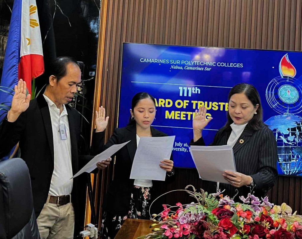 One of the highlights of the meeting was the oath-taking of the newly elected Faculty and Student Trustees โ€” Dr. Modesto P. Fucio, representing the academic sector, and Ms. Ann Kyla V. Aquiler, representing the student body.