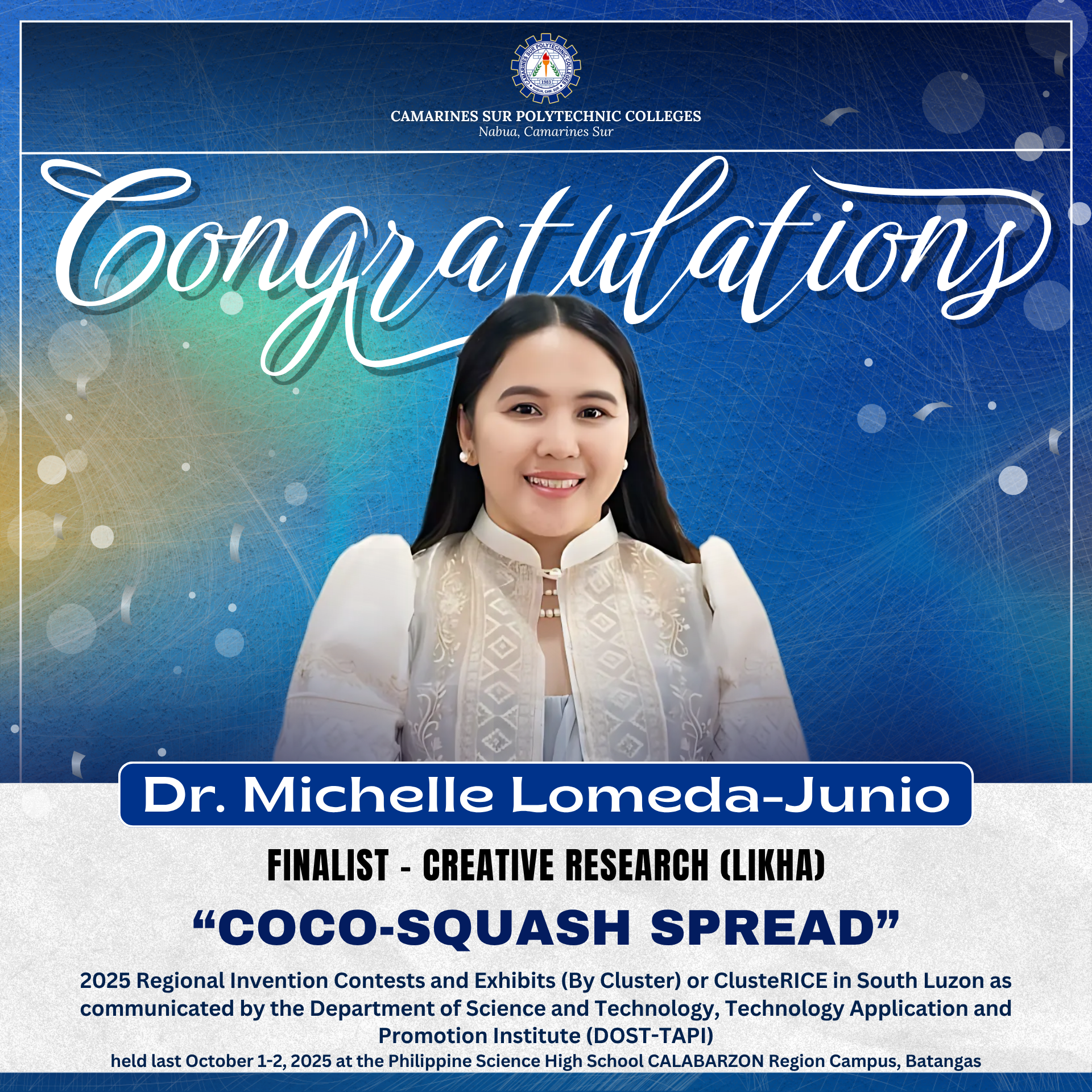 Congratulations to Dr. Michelle Lomeda–Junio for the successful presentation of her study, “Coco-Squash Spread,” in the 2025 Regional Invention Contests and Exhibits (By Cluster) or ClusterRICE – South Luzon, organized by the Department of Science and Technology – Technology Application and Promotion Institute (DOST-TAPI), on October 1-2, 2025, at the Philippine Science High School –...