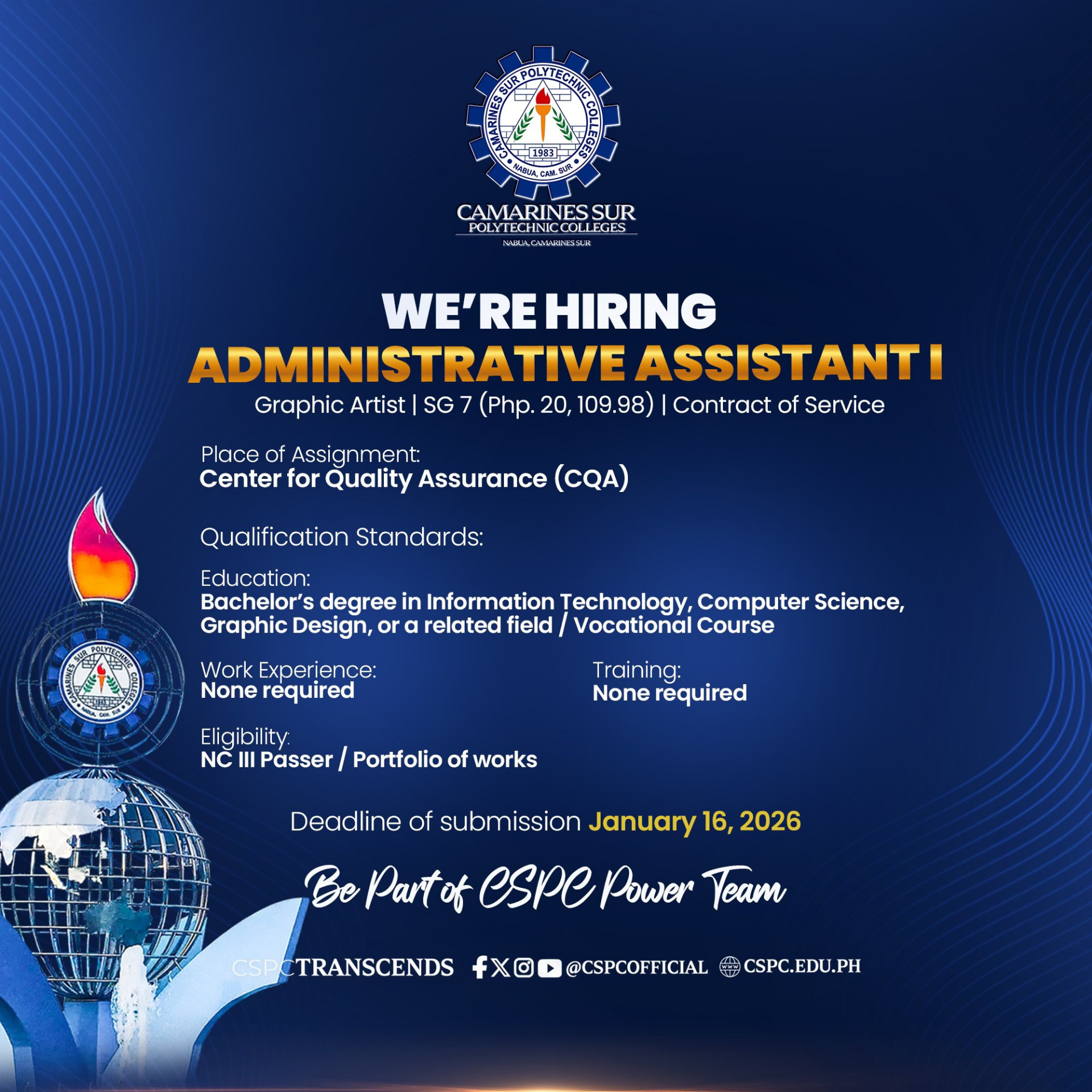 Camarines Sur Polytechnic Colleges invites applicants for: 💼𝗔𝗱𝗺𝗶𝗻𝗶𝘀𝘁𝗿𝗮𝘁𝗶𝘃𝗲 𝗔𝘀𝘀𝗶𝘀𝘁𝗮𝗻𝘁 𝗜 (𝗚𝗿𝗮𝗽𝗵𝗶𝗰 𝗔𝗿𝘁𝗶𝘀𝘁) position at the CSPC-Center for Quality Assurance (CQA) 📌Visit https://tinyurl.com/CSPCcareers for the complete notice. Interested and qualified applicants should signify their interest in writing. Attach the following documents to the application letter and send them to the address below: Application letter addressed to:...Read More