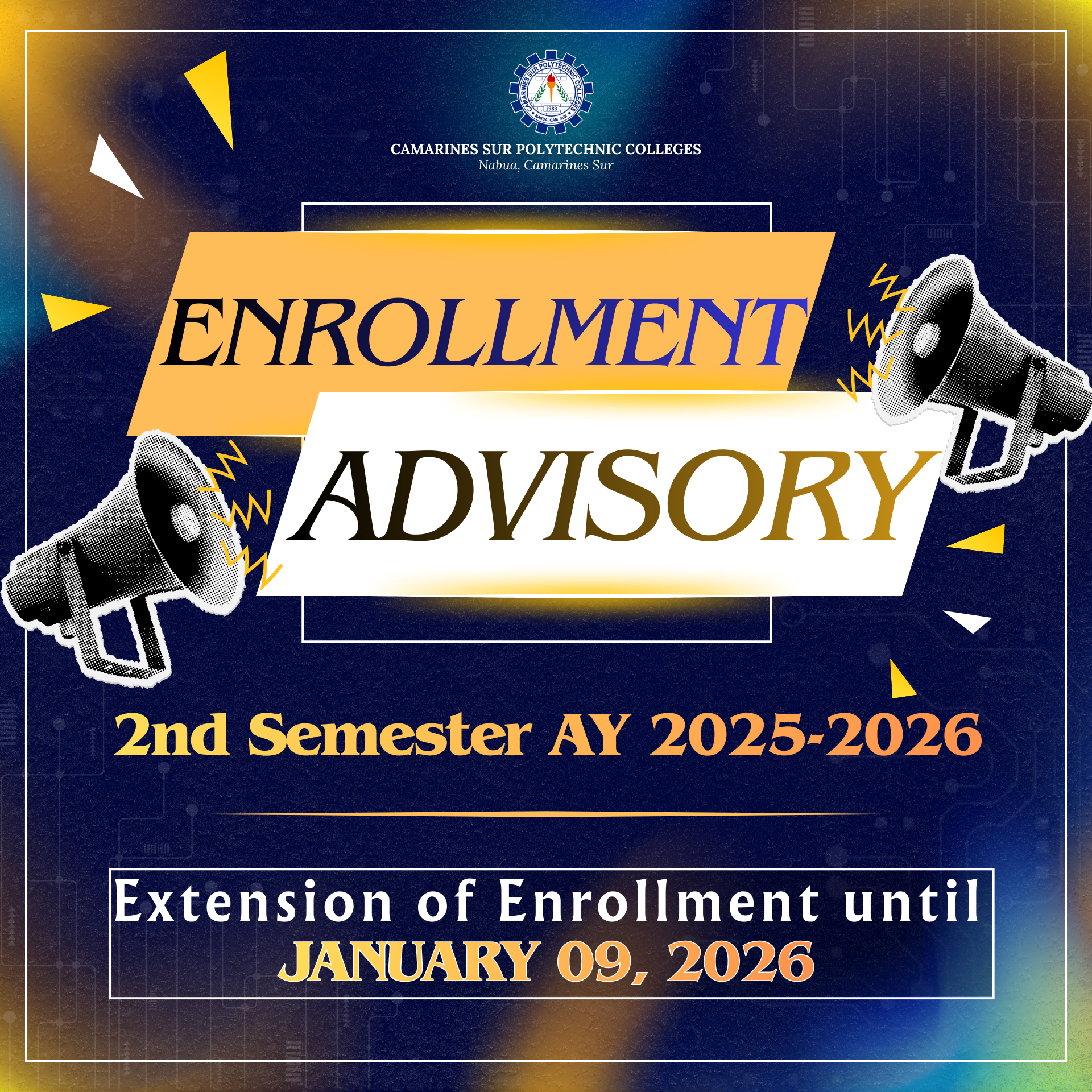 Camarines Sur Polytechnic Colleges (CSPC) announces the extension of enrollment for the Second Semester, Academic Year 2025–2026, scheduled until January 09, 2026. All concerned students are advised to complete their enrollment within the given period to ensure inclusion for the upcoming semester. For further details and updates, please refer to official CSPC announcements and platforms.Read More