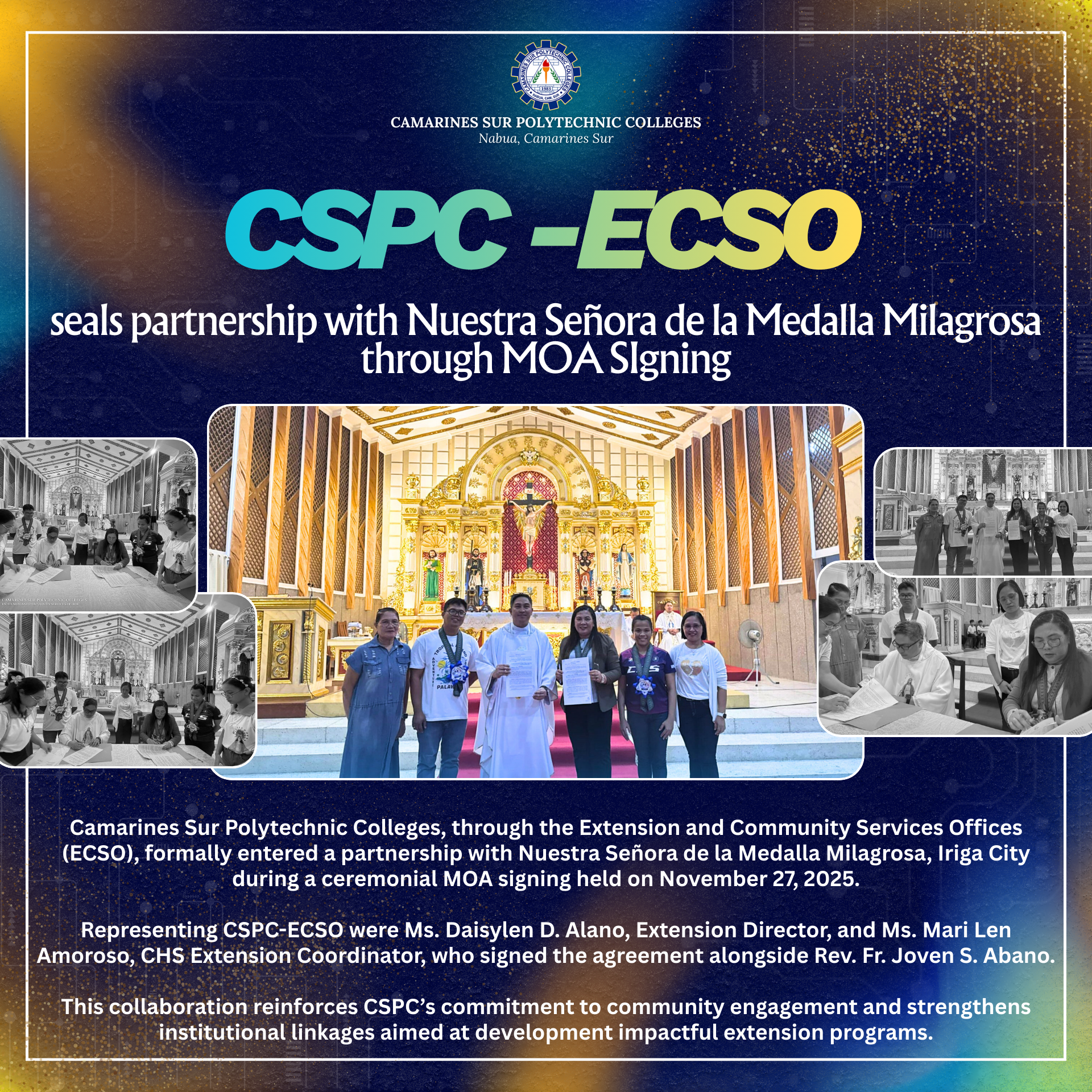 A ceremonial Memorandum of Agreement (MOA) signing was held between the CSPC-Extension and Community Services Office (ECSO) and Nuestra Señora de la Medalla Milagrosa, Iriga City, marking the formalization of a collaborative partnership. Representing CSPC-ECSO were Extension Director Ms. Daisylen D. Alano and CHS Extension Coordinator Ms. Mari Len Amoroso, November 27, 2028. The agreement...Read More