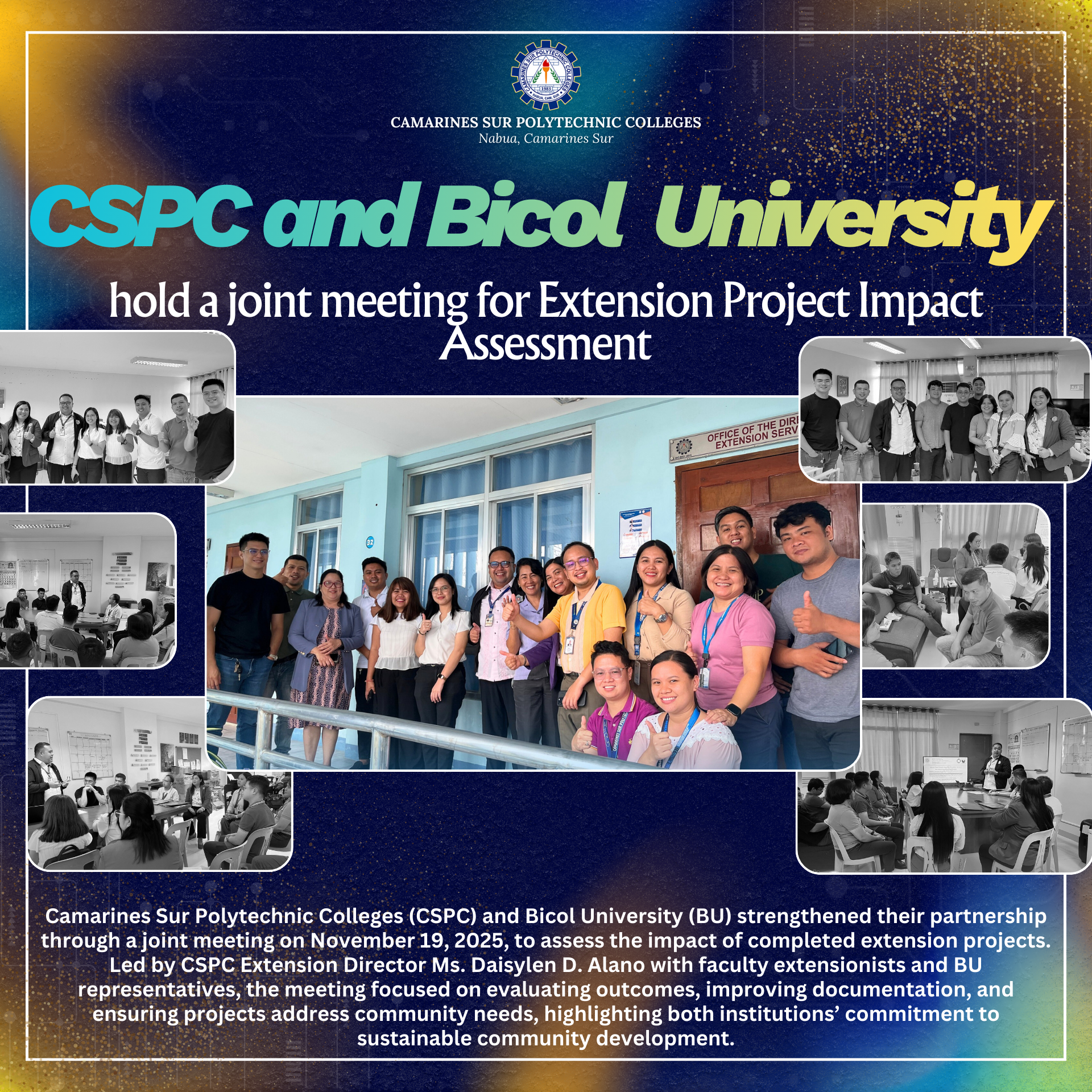 Camarines Sur Polytechnic Colleges (CSPC) and Bicol University (BU) convened for a collaborative meeting on November 19, 2025 at the CSPC Extension and Community Services Office to carry out the impact assessment of completed extension projects. The activity was led by Ms. Daisylen D. Alano, CSPC Extension Director, together with faculty extensionists from CAS, CCS,...Read More