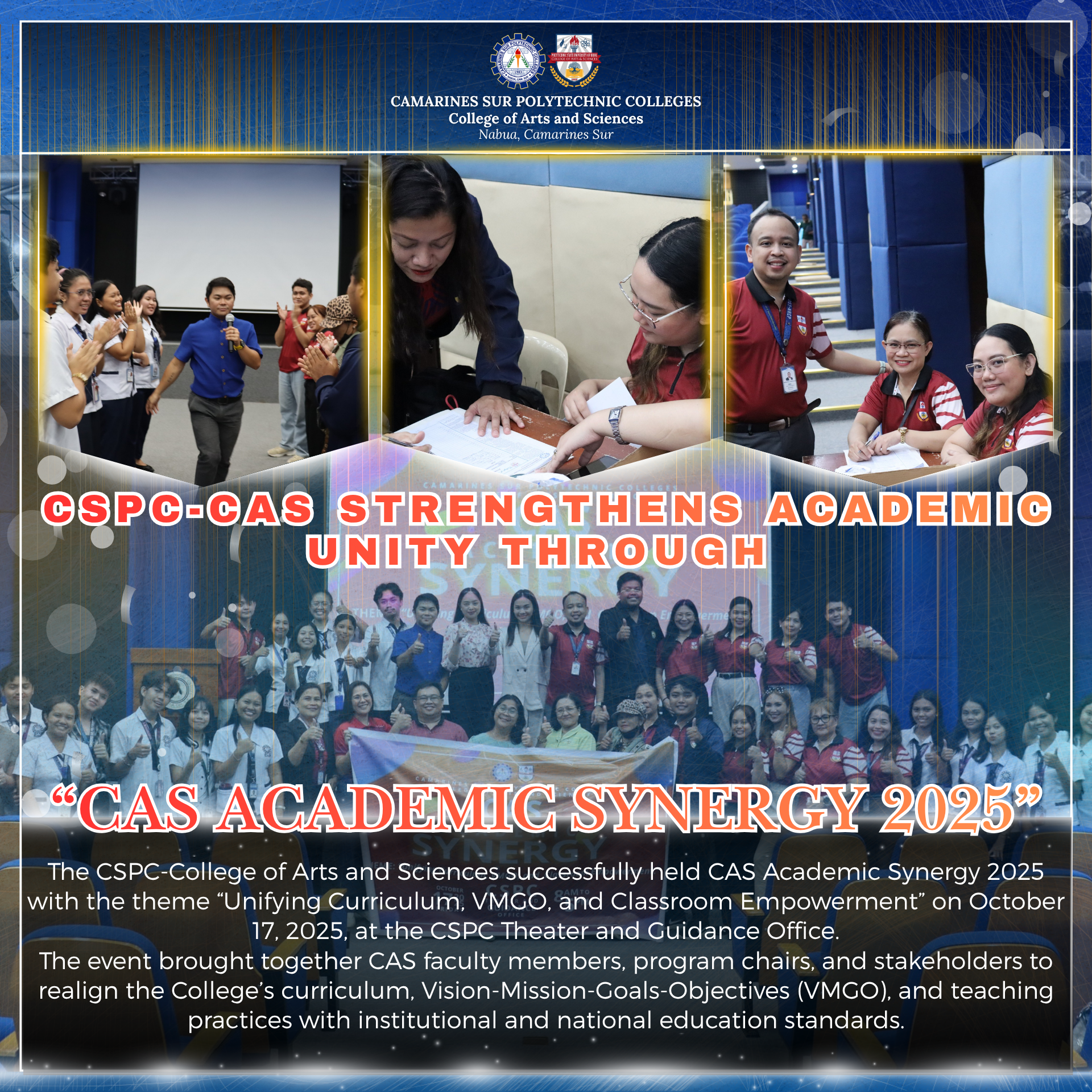 The College of Arts and Sciences (CAS) serves as a vital academic unit within the institution, offering a diverse range of programs designed to develop critical thinking, creativity, and interdisciplinary skills among students. In addition to its specialized programs, CAS is the primary service provider of General Education (GE) courses across various degree programs, ensuring that all students receive a well-rounded academic foundation. Its core function is to provide a strong basis in liberal arts and sciences, preparing students for fields such as communication, language studies, social sciences, mathematics, and public administration. CAS aims to foster intellectual growth, cultural awareness, and social responsibility, empowering students to become innovative professionals and responsible citizens in a rapidly changing world.