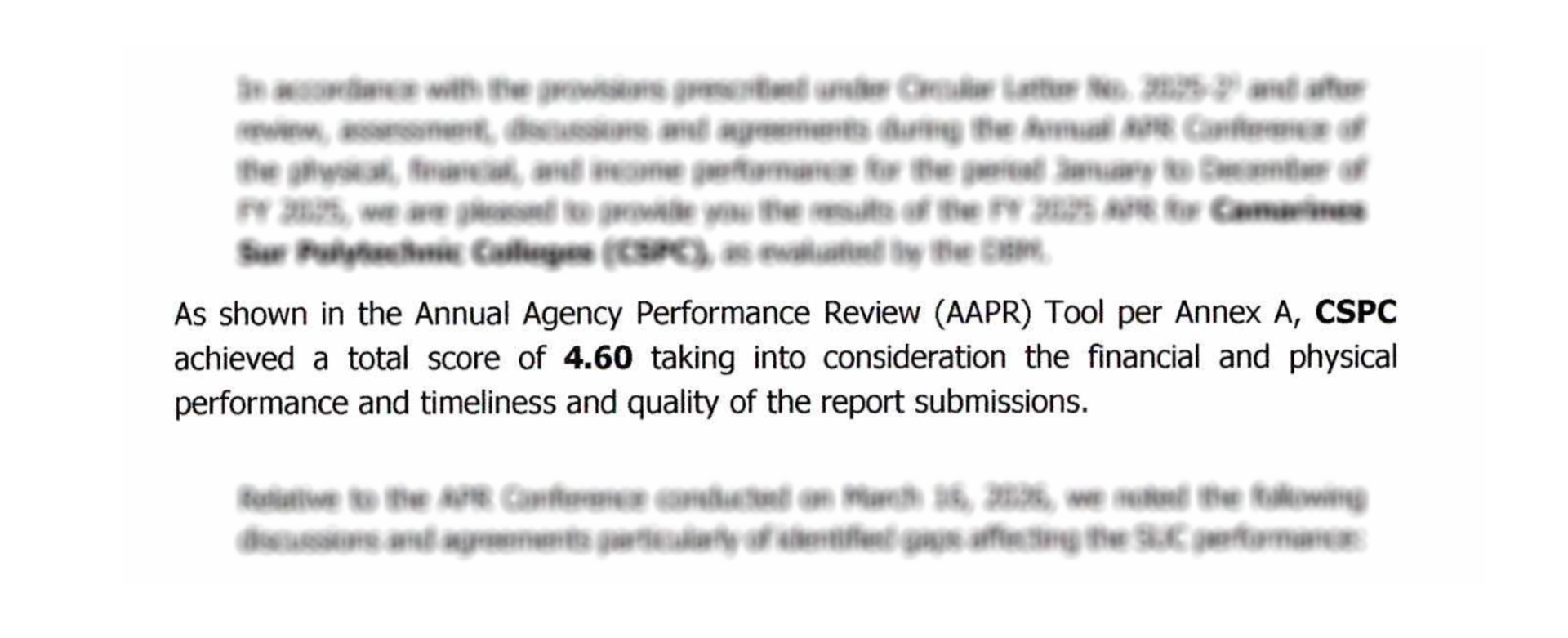 Camarines Sur Polytechnic Colleges (CSPC) has achieved a notable performance rating of 4.60 in the Fiscal Year 2025 Annual Performance Review (APR), as evaluated by the Department of Budget and Management (DBM) Regional Office V In accordance with Circular Letter No. 2025-2, the assessment was based on the institution’s physical, financial, and income performance from...Read More