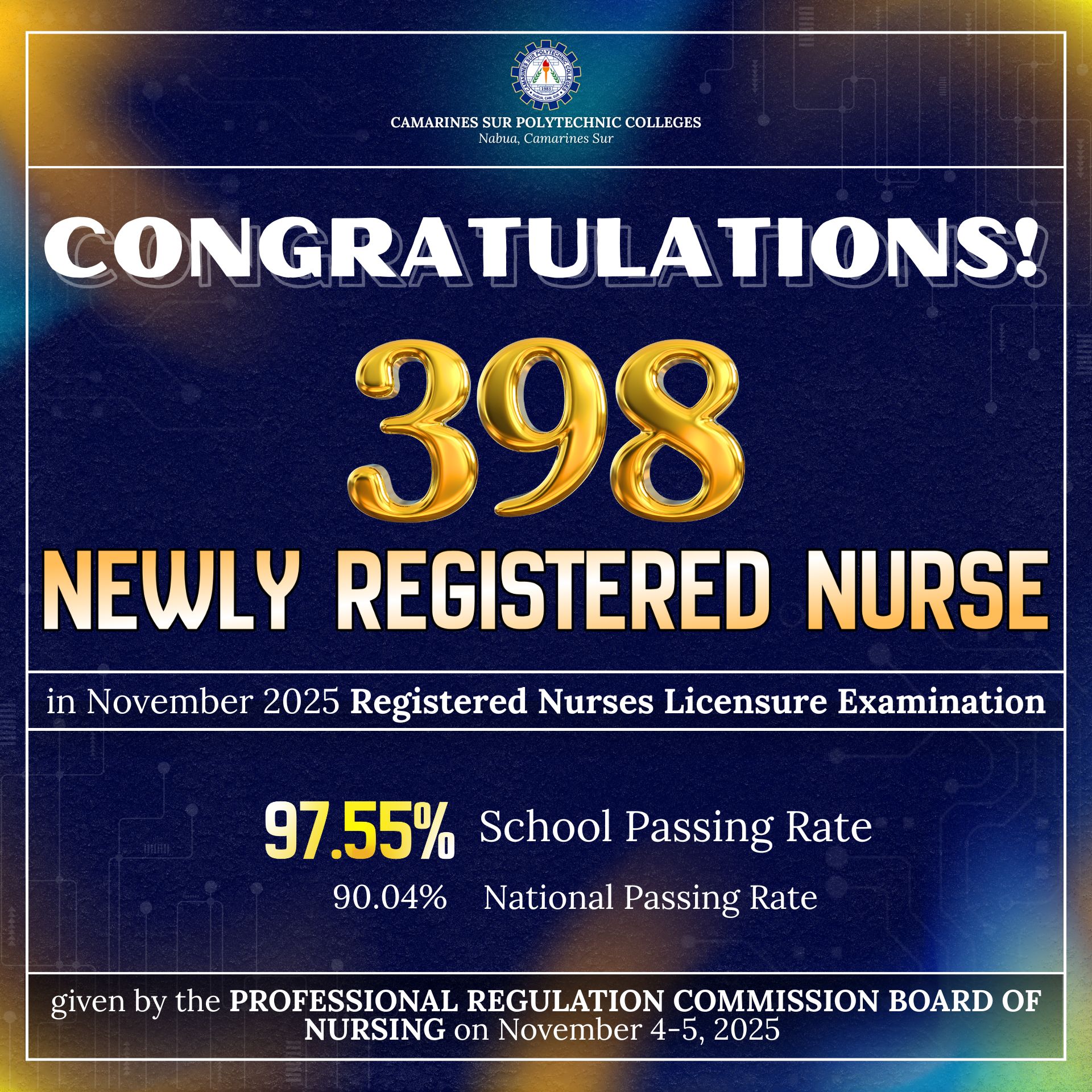 Camarines Sur Polytechnic Colleges proudly congratulates its 398 new Registered Nurses for successfully passing the November 2025 Nursing Licensure Examination. We extend special recognition to 𝗗𝗶𝗮𝗻𝗲 𝗙𝗲 𝗔. 𝗚𝗮𝘀𝗴𝗮, 𝗥𝗡, for securing Top 8 ( 92.40% ) nationwide—an achievement that reflects her dedication, competence, and exemplary performance. With a 97.55% school passing rate, CSPC continues...Read More