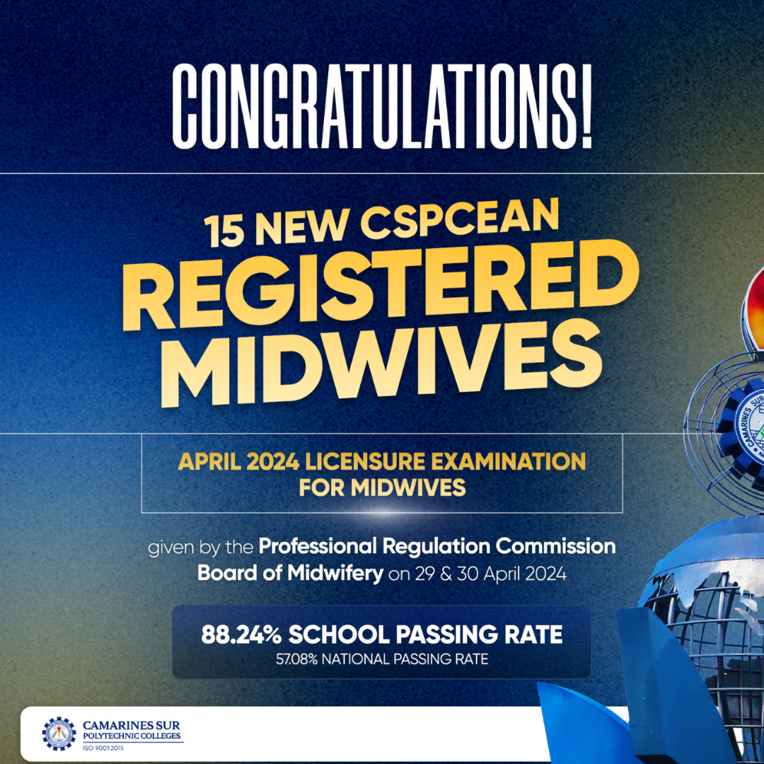 Judah Paulo Espero, a student from Bachelor of Science in Midwifery (BSM) 3A program at the College of Health Sciences (CHS), placed 1st in the recently concluded Philippine Midwifery Licensure Examination (PMLE) held on April 29-30 2024. Additionally, Camarines Sur Polytechnic Colleges (CSPC) attained an impressive overall passing rate of 88.24%, with a 100% rating...Read More
