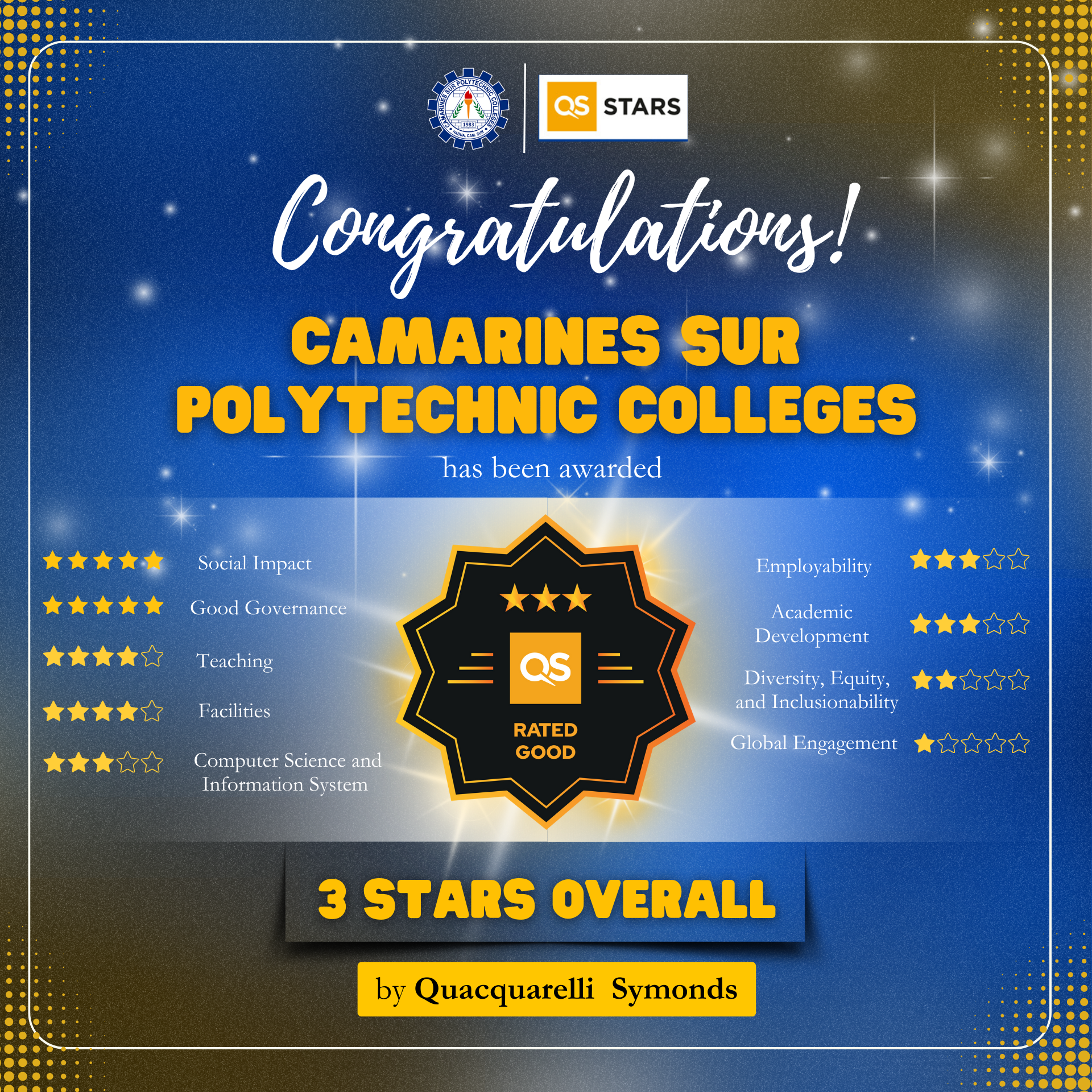 Camarines Sur Polytechnic Colleges proudly announces its remarkable achievement in its inaugural participation in the QS Stars™ University Rating System, securing an overall three-star 🌟🌟🌟 rating! In this comprehensive evaluation, the institution demonstrated exemplary accomplishment in several critical areas of academic excellence: ✅ Social Impact: ⭐ ⭐ ⭐ ⭐ ⭐ ✅ Good Governance: ⭐ ⭐...Read More