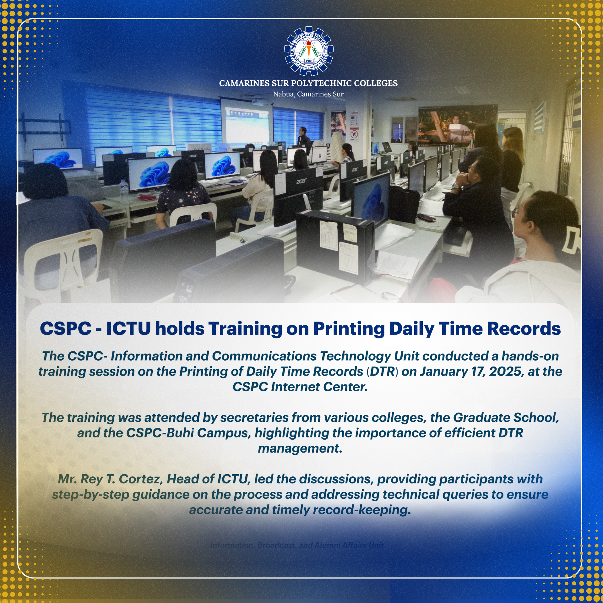 The CSPC – Information and Communication Technology Unit conducted a hands on training session on the Printing of Daily Time Records (DTR) on January 17, 2025, at the CSPC Internet Center. The training was attended by secretaries from various colleges, the Graduate School, management. Mr. Rey T. Cortez, Head of ICTU, led the discussions, providing...Read More