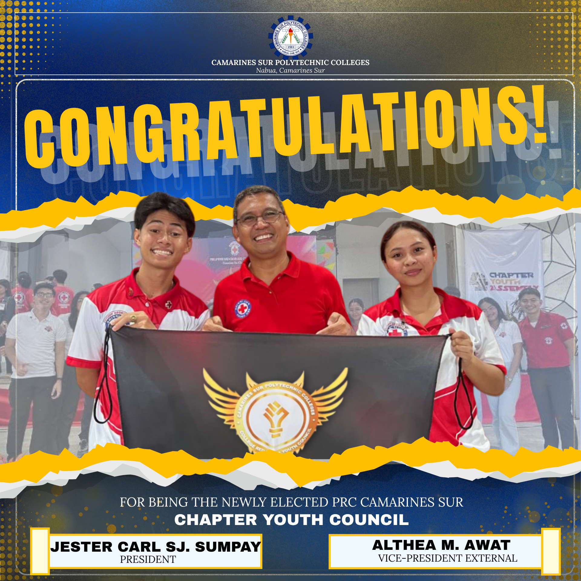 Two of our CSPC – College Red Cross Youth Council Officers have been officially elected as the 𝘾𝙝𝙖𝙥𝙩𝙚𝙧 𝙔𝙤𝙪𝙩𝙝 𝘾𝙤𝙪𝙣𝙘𝙞𝙡 𝙊𝙛𝙛𝙞𝙘𝙚𝙧𝙨. The incumbent Assistant Secretary of CSPC – CRCYC, 𝑴𝒓. 𝑱𝒆𝒔𝒕𝒆𝒓 𝑪𝒂𝒓𝒍 𝑺𝑱. 𝑺𝒖𝒎𝒑𝒂𝒚 was elected as the new 𝑷𝒓𝒆𝒔𝒊𝒅𝒆𝒏𝒕 of the CYC Camarines Sur and the incumbent Co-Chairperson of the Learning and Innovation...Read More