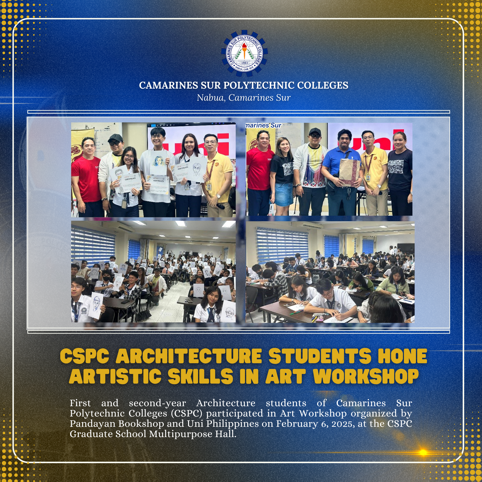 First and second-year Architecture students of Camarines Sur Polytechnic Colleges (CSPC) participated in Art Workshop organized by Pandayan Bookshop and Uni Philippines on February 6, 2025, at the CSPC Graduate School Multipurpose Hall. The workshop aimed to enhance students’ artistic skills and creativity, providing hands-on training in various art techniques essential for architectural design and...Read More
