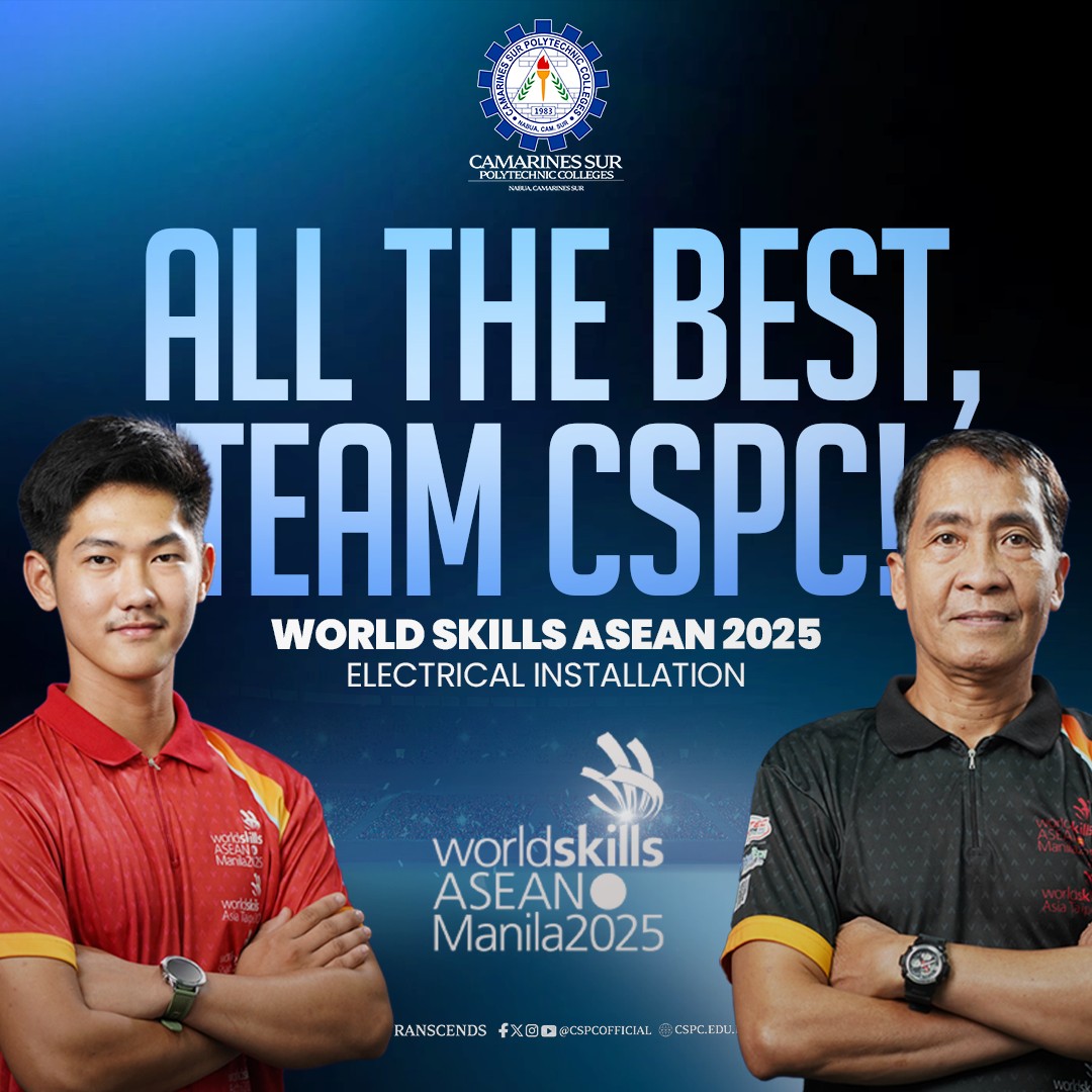 Camarines Sur Polytechnic Colleges extends its full support to our very own James Cavin Sayago BS Electrical Engineering (Competitor) and Engr. Eddie Cabaltera, Faculty, College of Engineering and Architecture (Expert) as they represent the Philippines in the WorldSkills ASEAN 2025 – Electrical Installation. Happening on August 26–28, 2025 at the World Trade Center, Metro Manila,...Read More
