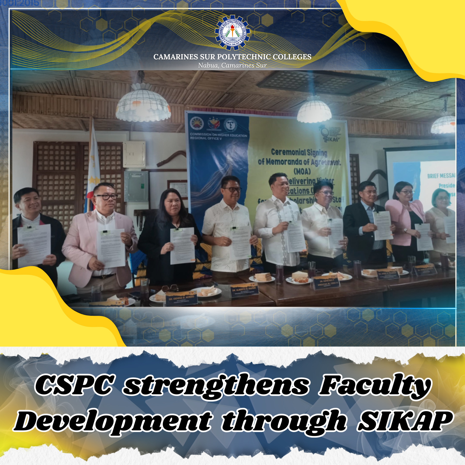 SUC President II Dr. Amado A. Oliva, Jr. attended the Ceremonial MOA Signing with Delivering Higher Education Institutions (GHEIs) for the SIKAP Program on August 18, 2025, at Casa Lorenzo, Daraga, Albay. The event affirms CSPC’s strong commitment to advancing faculty and staff development.Read More