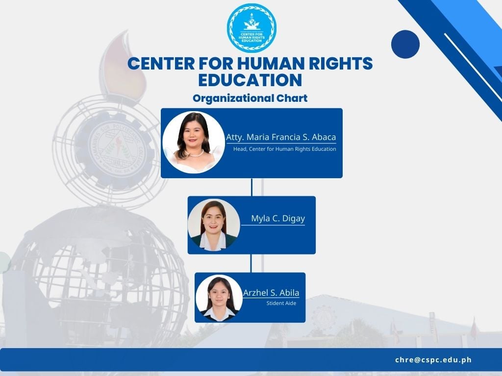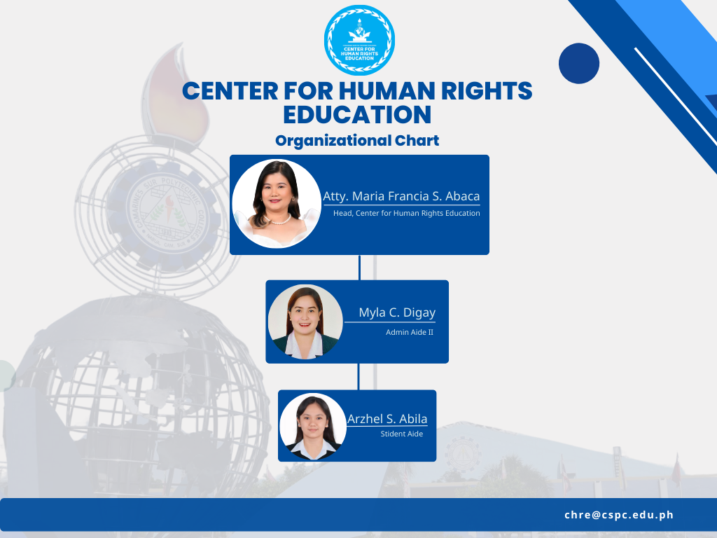 The Center for Human Rights Education (CHRE) is one of the flagships sub-programs of the Commission on Human Rights under the Human Rights Institute Program, which aims to strengthen its mandate to develop continuing program of research, education, and information to enhance respect for the primacy of the human rights. The Center design and implements a human rights education of CSPC and nearby constituents assists other government agencies and non-governmental organizations in the preparation and implementation of their human rights and education programs.