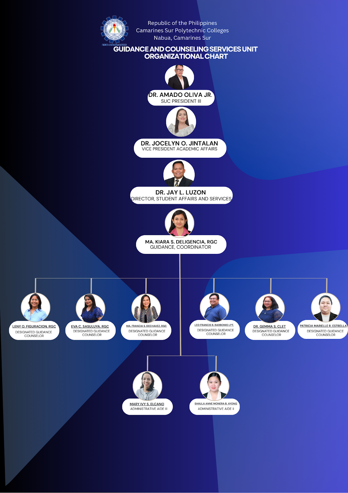 The goal of Camarines Sur Polytechnic Colleges’ Guidance and Counseling Office is to assist students in advancing their academic, professional, and personal lives. The office offers a secure and private setting where students can get assistance on a range of issues, including career preparation, academic difficulties, and emotional well-being. Through career assessments, individual and group counseling, and developmental programs, the goal of the office is to assist students in overcoming obstacles in life, making wise decisions, and realizing their full potential. In addition to ensuring that every student has a fulfilling and enjoyable time while attending college, the committed staff of professional counselors is dedicated to supporting mental health and personal development.