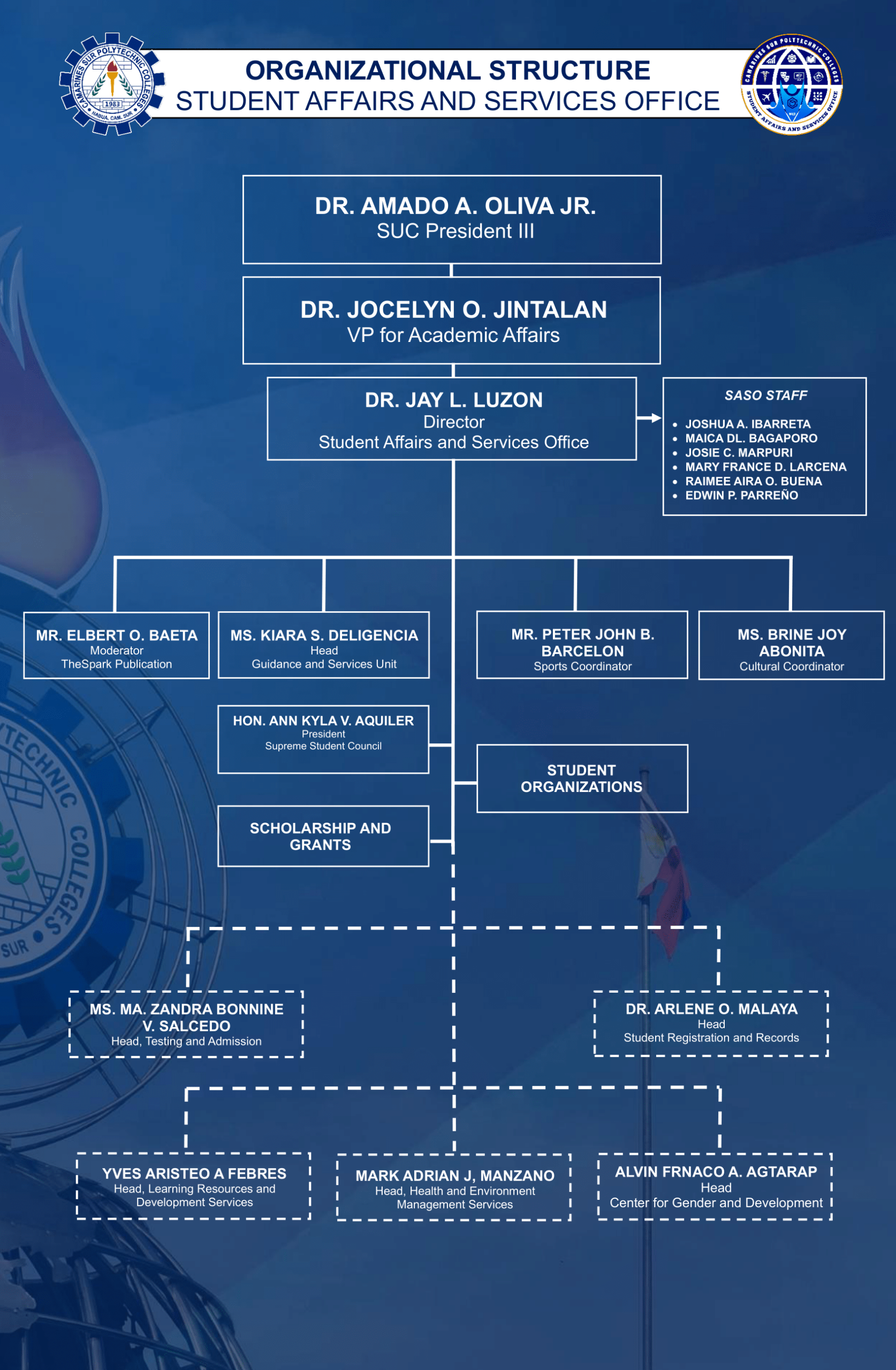 The units under the Student Affairs and Services Office shall be: Sports and Cultural Development, Multi-faith Office, Bands and Majorettes, Guidance Services, and SPARK Publication. Its objectives are to:ย