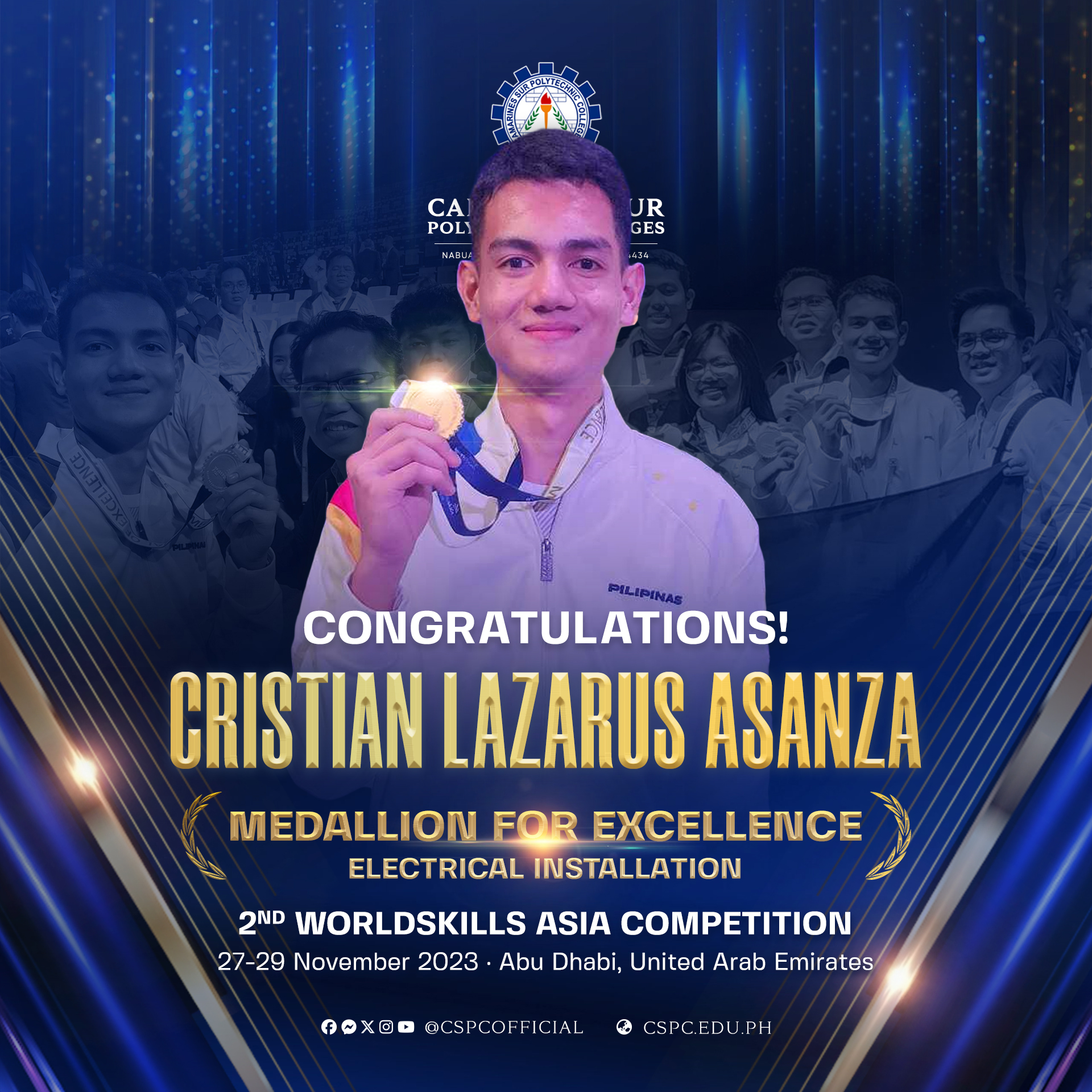 Cheers to Cristian Lasaruz Asanza, a third-year Electrical Engineering student, who electrified our path to international recognition by representing the Philippines at the 2nd WorldSkills Asia Competition and securing the Medallion for Excellence in Electrical Installation!