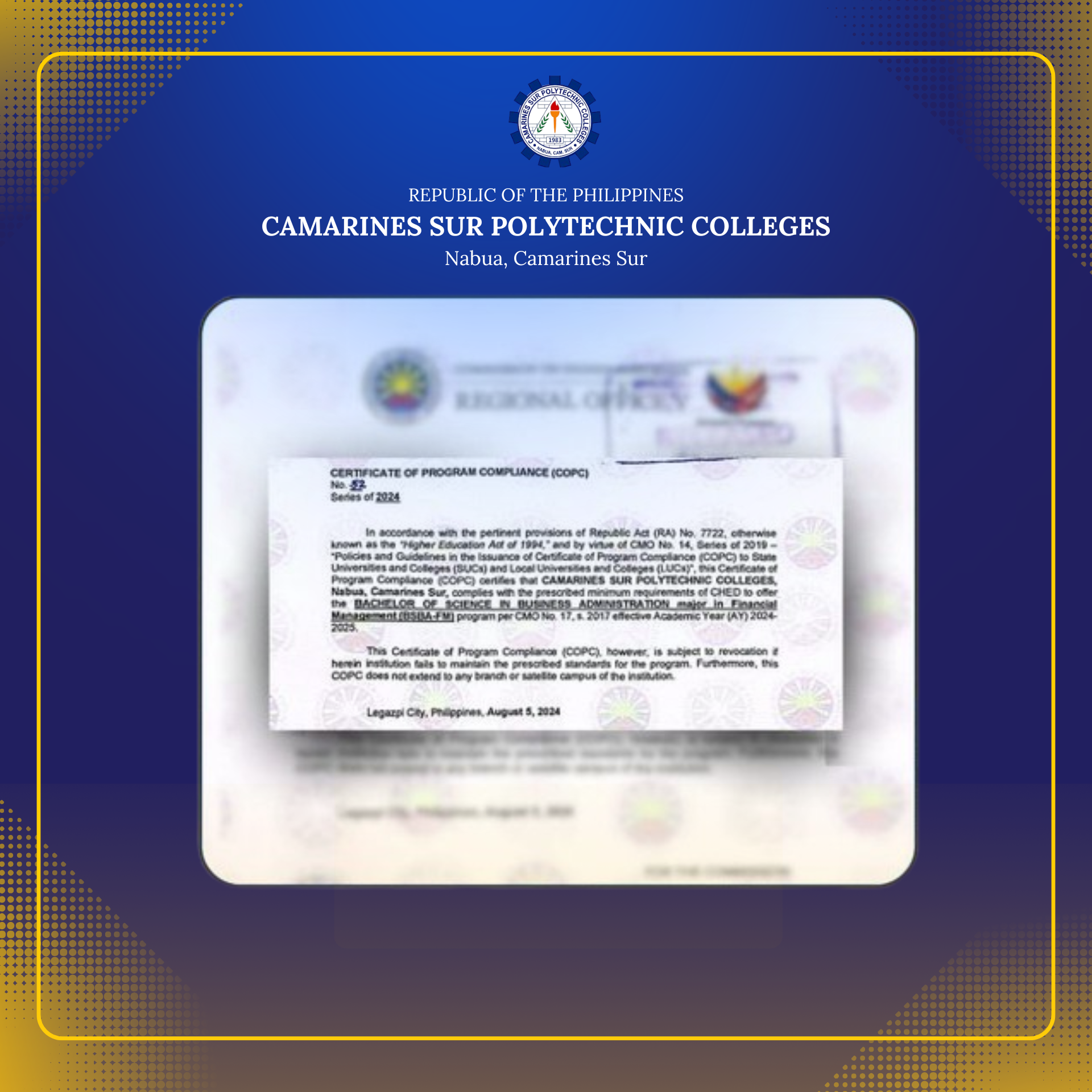 After a year upon its offering, the Bachelor of Science in Business Administration major in Financial Management was granted with its Certificate of Program Compliance (COPC) by the Commission on Higher Education Regional Office V (CHED RO V). According to the BSBA-FM Program Chair, Mr. Roque B. Cruz II, this 𝙖𝙘𝙘𝙤𝙢𝙥𝙡𝙞𝙨𝙝𝙢𝙚𝙣𝙩 𝙚𝙢𝙥𝙝𝙖𝙨𝙞𝙯𝙚𝙨 𝙩𝙝𝙚 𝙘𝙤𝙢𝙢𝙞𝙩𝙢𝙚𝙣𝙩 𝙖𝙣𝙙...Read More