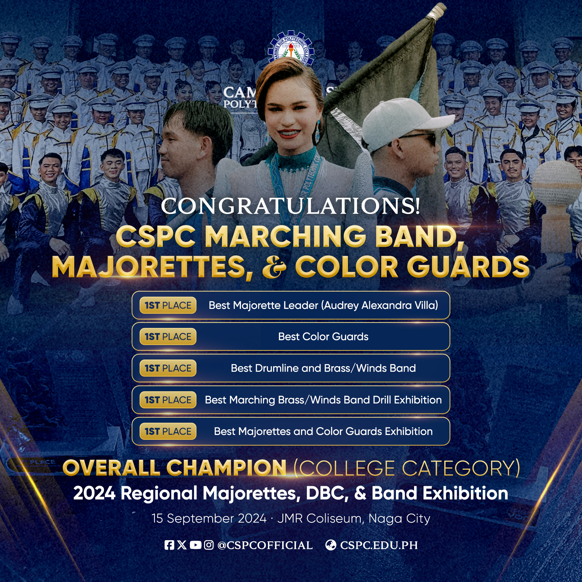𝗡𝗔𝗚𝗛𝗔𝗛𝗔𝗟𝗜 𝗦𝗔 𝗦𝗔𝗡 𝗠𝗜𝗚𝗨𝗘𝗟, 𝗡𝗔𝗕𝗨𝗔, 𝗖𝗔𝗠𝗔𝗥𝗜𝗡𝗘𝗦 𝗦𝗨𝗥! 🏆 Camarines Sur Polytechnic Colleges, through the CSPC Marching Band, CSPC Nabua Majorettes, and the CSPC Performing Arts – Dance Troupe, is Bicolandia’s undisputed champion as evidenced by the results of the 2024 Regional Majorettes, DBC, and Band Exhibition! At the competition held on 15 September 2024, at...Read More